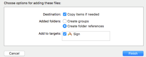 Select Copy items if needed and Add to targets. Check that the target indicates your project (in our case the name of the project is Sign).