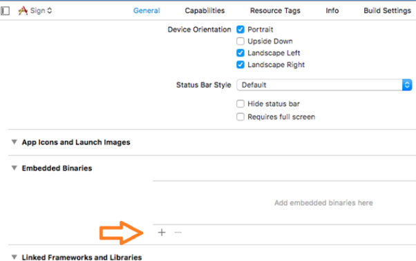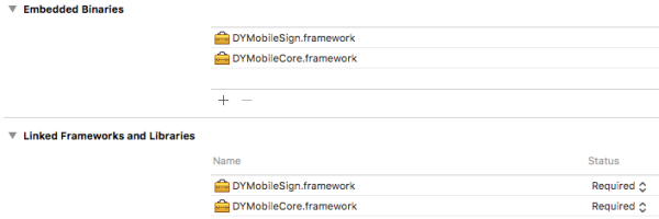 - Dynamic framework: Click the ”+” icon in the Embedded Binaries section and select the Core framework file.