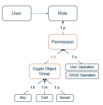 We use key groups to specify a role restricted to use the specified group of keys, certificates, and secrets. In addition, we restrict their use by operations in the allowed-list. The bundle of allowed objects and allowed operations is a Permission. A role is a set of one or more permissions.