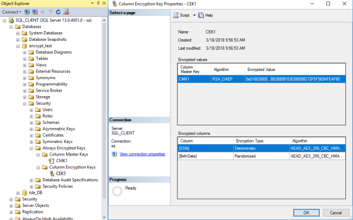 - Expand Databases > encrypt_test > Security > Always Encrypted Keys > Column Encryption Keys.