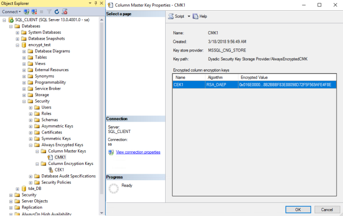 - Expand Databases > encrypt_test > Security > Always Encrypted Keys > Column Master Keys.